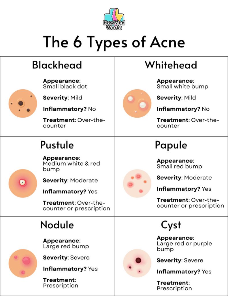 Here’s a summary chart of the six types of acne, along with some helpful illustrations for reference: